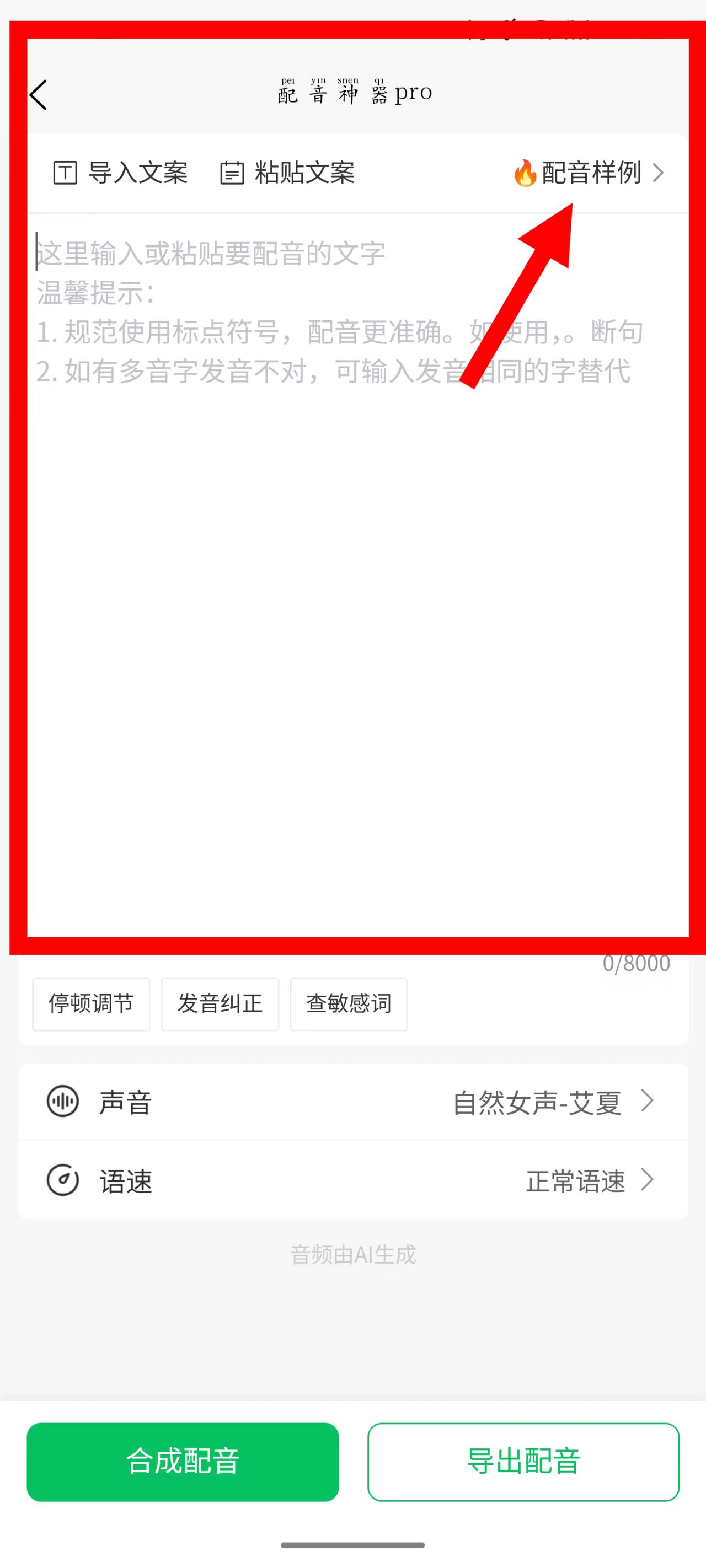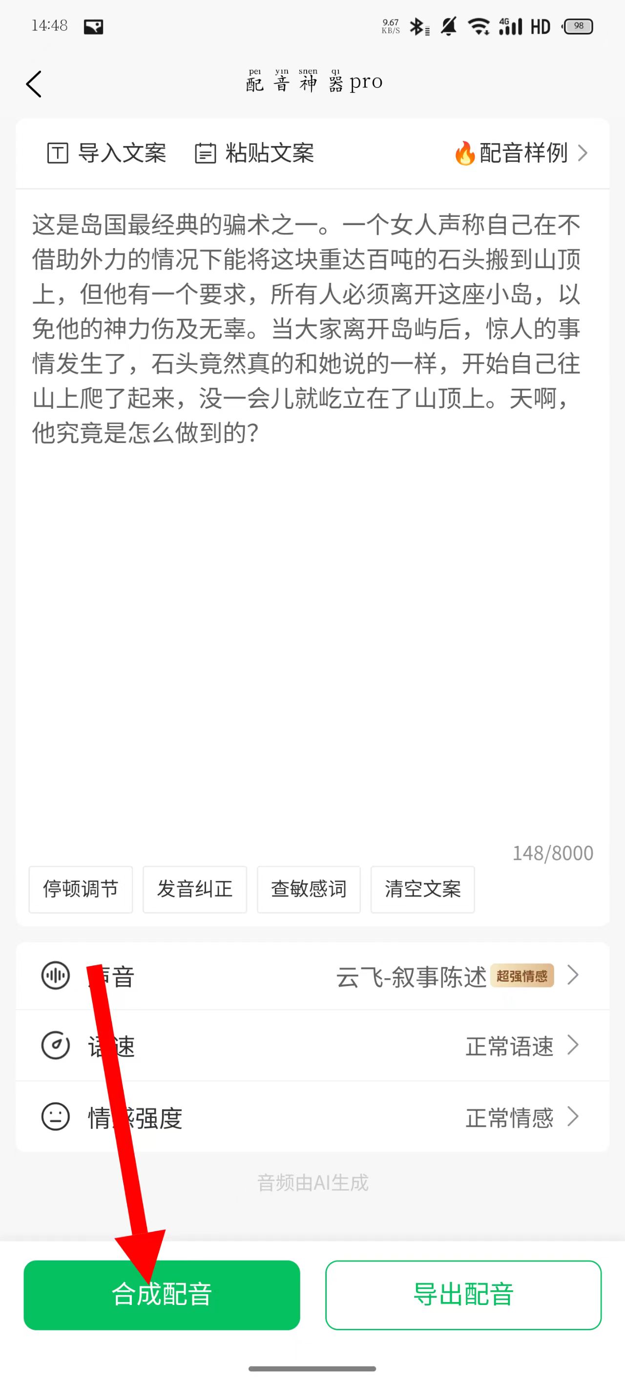 4、文案自动填充到输入框后,点击底部合成配音,即可生成同款配音音频。