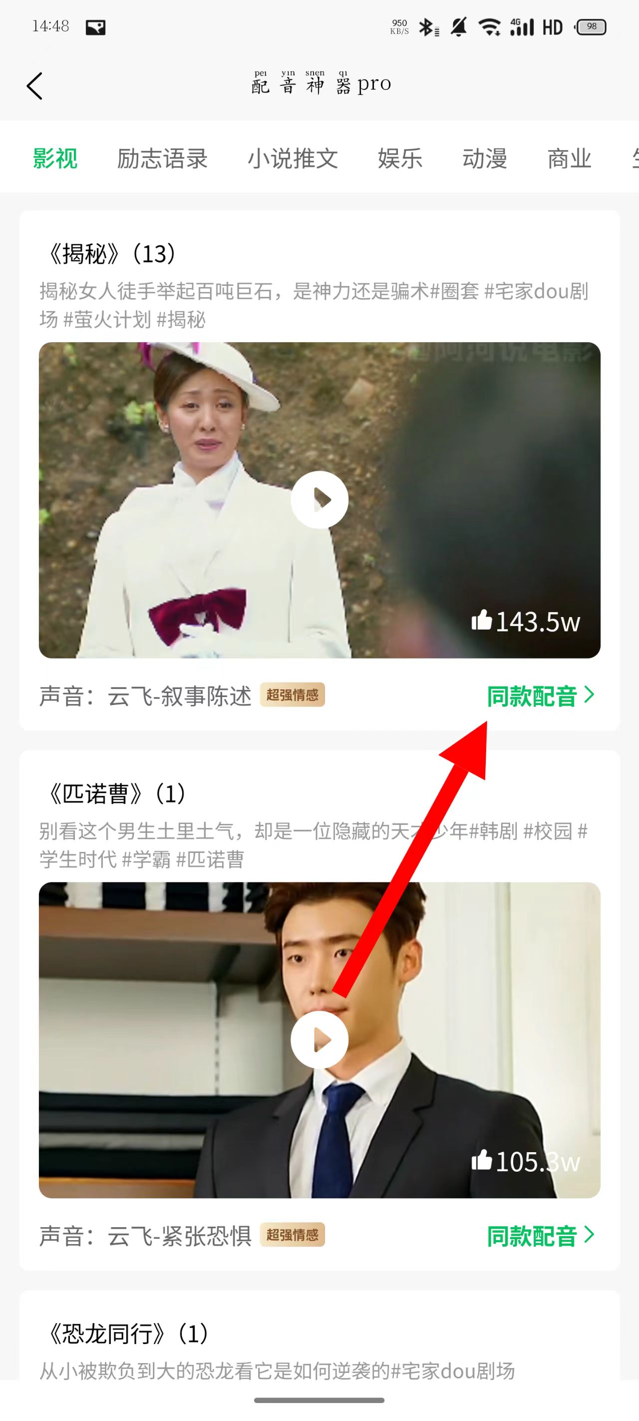 3、在配音样例列表里,选择心仪的样例,点击其右侧同款配音。