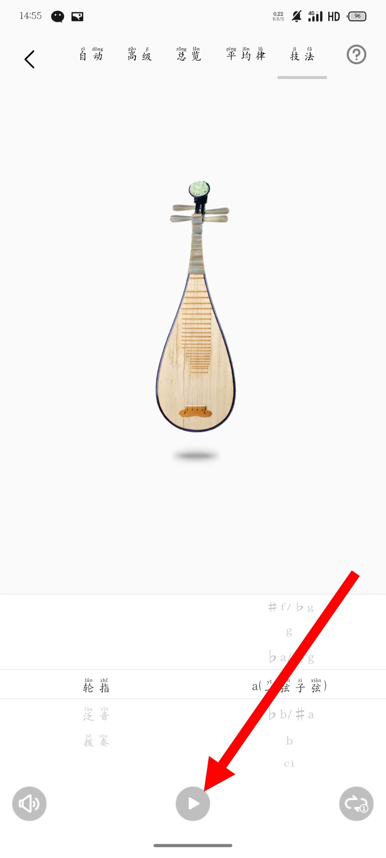 4、切换到技法功能页,点击底部播放按钮,即可模拟琵琶演奏。