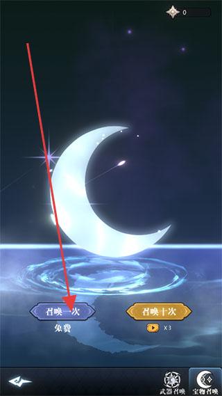 1、进入召唤界面看到月牙形背景,点击召唤一次按钮,若有免费机会可免费抽取道具,还能点击召唤十次,消耗资源批量召唤来丰富装备物品储备。