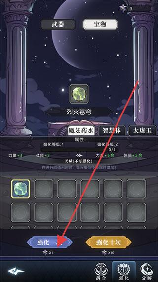 2、切换至宝物界面,选中宝物后,点击强化按钮,消耗对应材料来提升宝物强化等级,增加力量,体质等属性。
