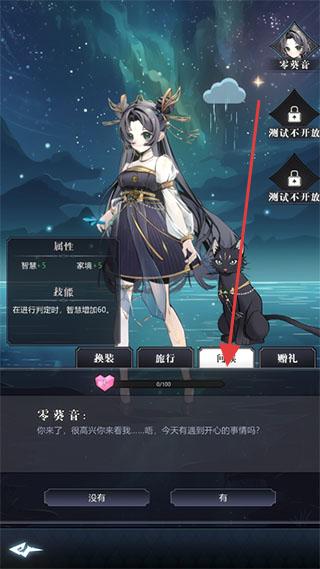 3、在角色零寒音界面,点击交谈与她对话,面对询问,选择正确的选项,提升好感度解锁剧情。