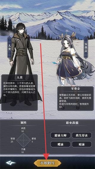 4、在转生界面了解种族信息及职业技能,确认角色体质,智慧等属性后,点击开始转生开启新的异世界旅程。