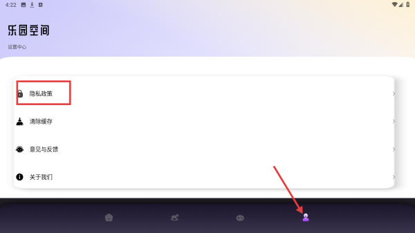 4、点击底部对应按钮,进入乐园空间页面,可查看隐私政策、清除缓存等设置选项。