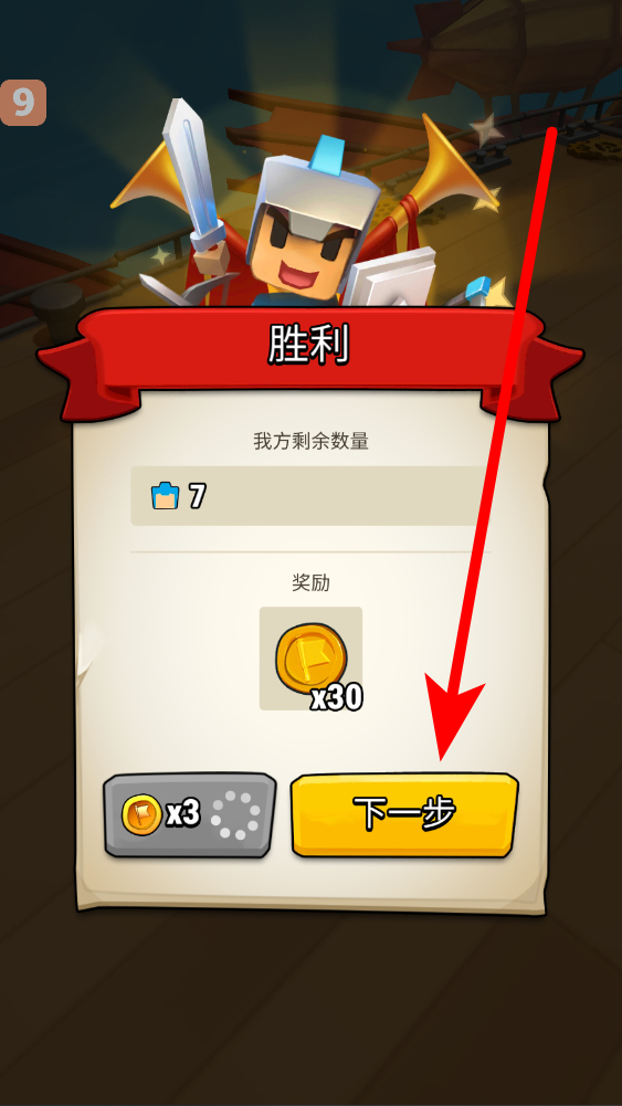 4、最后获取胜利奖励,成功战胜敌方后,会出现胜利界面,展示己方剩余数量以及获得的奖励,点击下一步,可继续后续的游戏进程。