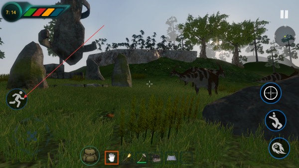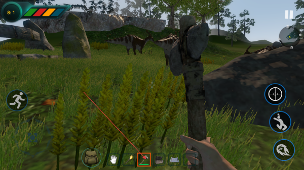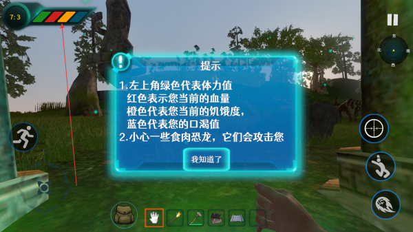 1、进入留意左上角提示,绿色条代表角色体力值,橙色是饥饿度,蓝色是口渴值,要维持数值正常,避免角色状态不佳,同时,小心肉食恐龙攻击。