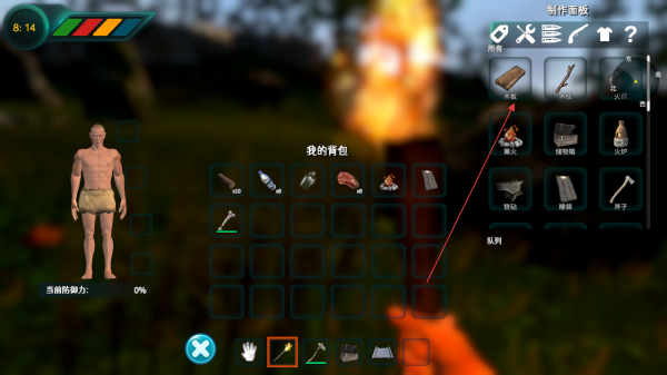 4、打开我的背包界面,查看收集到的物品,点击制作面板,消耗材料制作生存必需品,像木棍、火把等,保障生存需求。