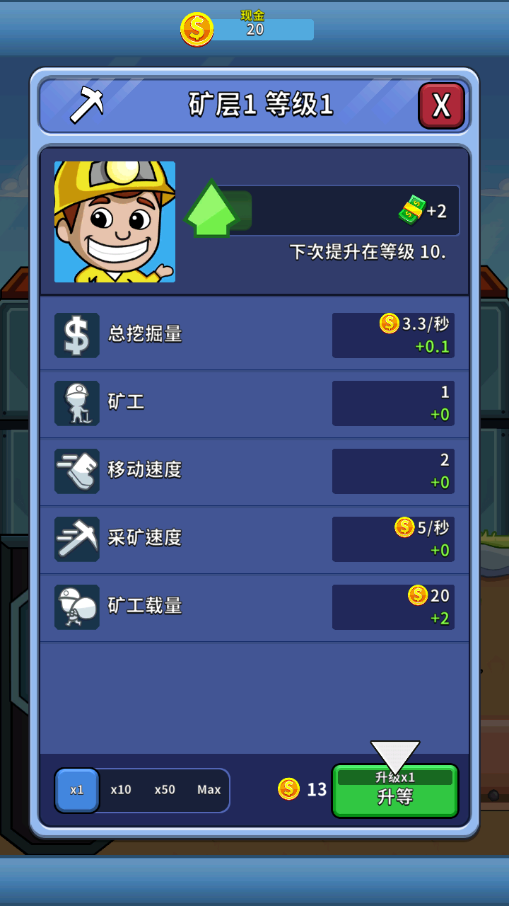 3、积累一定现金后,点击等级按钮,消耗金钱升级矿工或矿层提升采矿效率。
