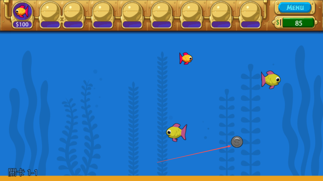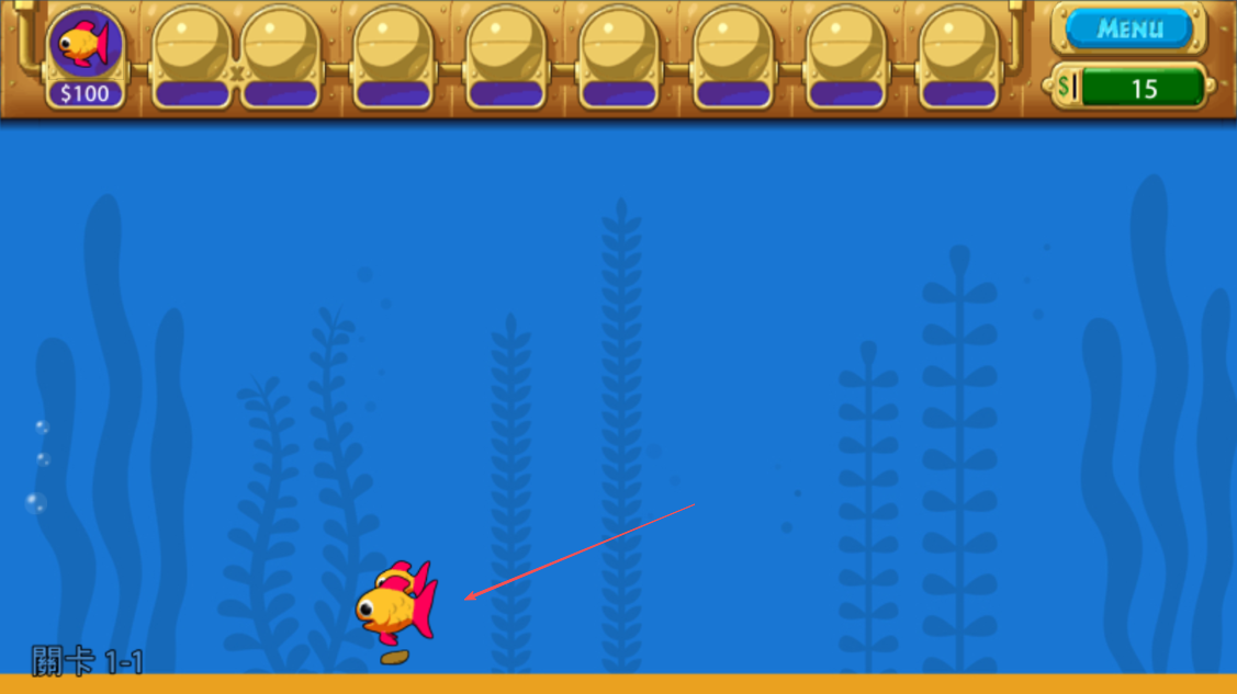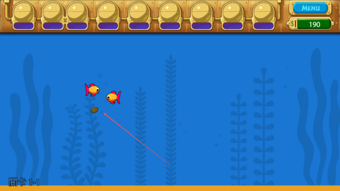 1、进入游戏关卡1-1,查看右上角的金钱数量,观察小鱼位置,点击屏幕投放食物。