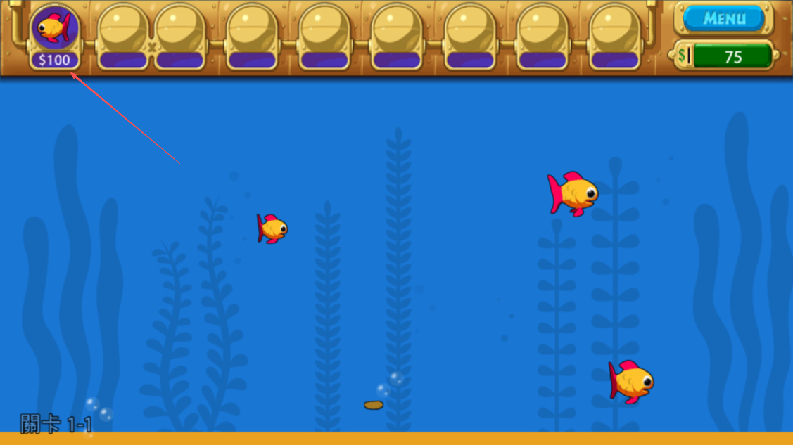 2、当小鱼吃掉食物后,会产出金币,收集金币,此时金钱数量会发生变化,如变为$75。