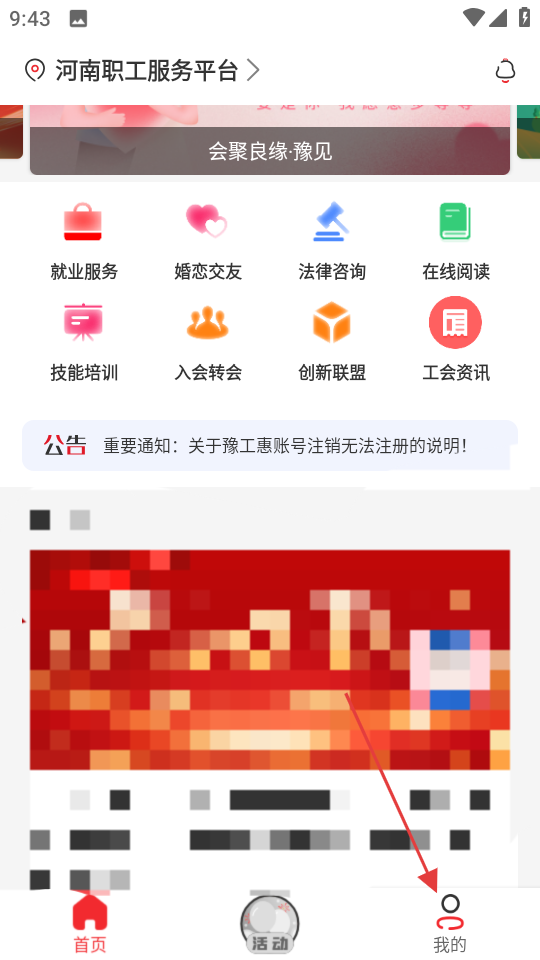 1、在河南职工服务平台首页,点击底部我的,进入个人中心页面。