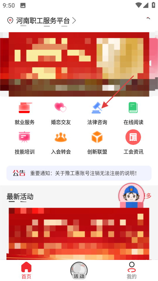 1、在河南职工服务平台首页,点击法律咨询,进入法律咨询页面。