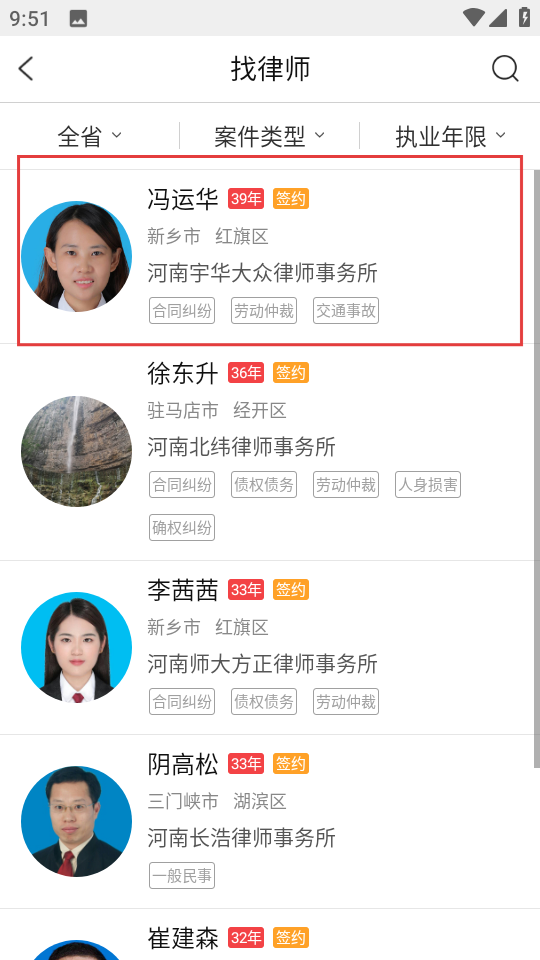 3、在找律师页面,选择律师,如冯运华,进入律师资料页面。