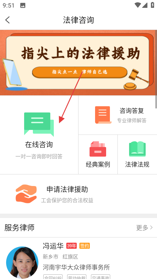 2、在法律咨询页面,点击在线咨询,进入找律师页面。