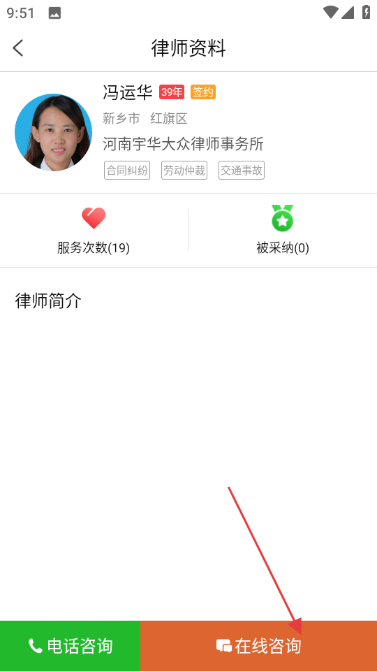 4、在律师资料页面,点击在线咨询,可与该律师进行在线咨询。
