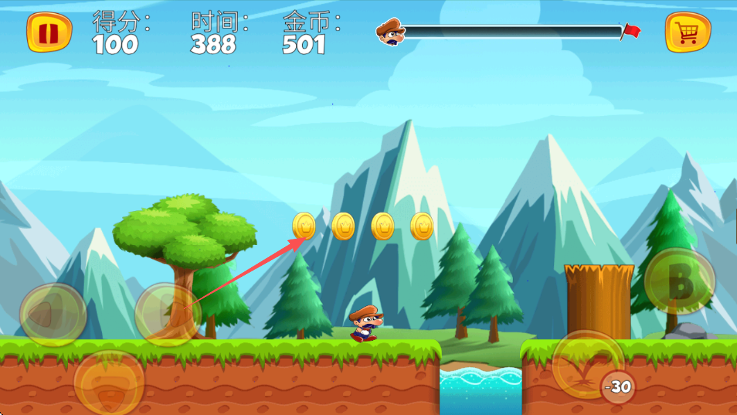 4、在规定时间内,不断前进,收集金币、躲避和消灭敌人,抵达关卡终点。
