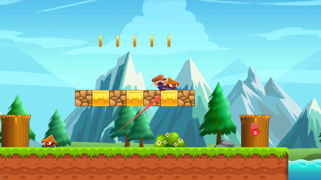 3、控制角色跳跃,顶破带有金币标志的砖块获取金币,增加金币数量。