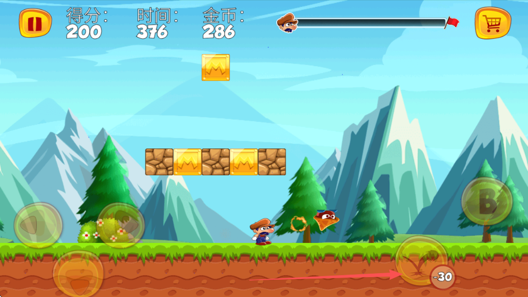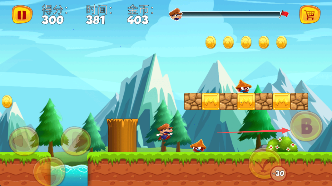 1、进入游戏,留意上方的得分、时间和金币数据,借助左下角方向键操控角色在场景中移动。