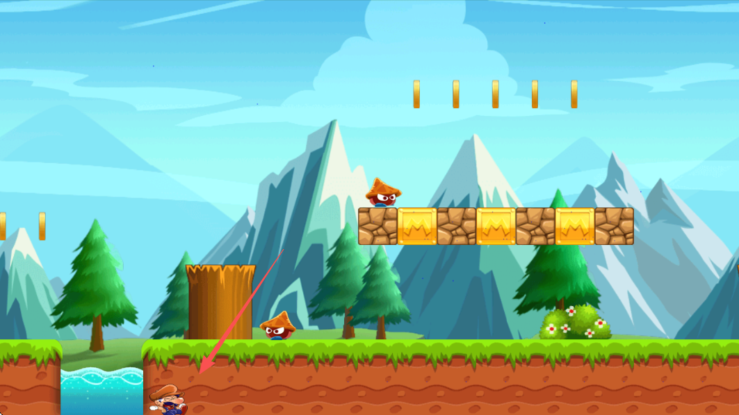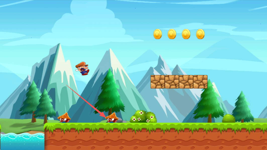 4、遇到带金币标识的砖块,让角色跳跃顶破砖块获取奖励,朝着关卡终点的旗帜推进。