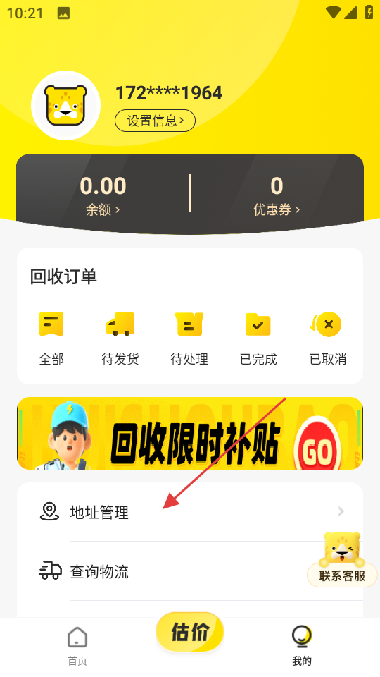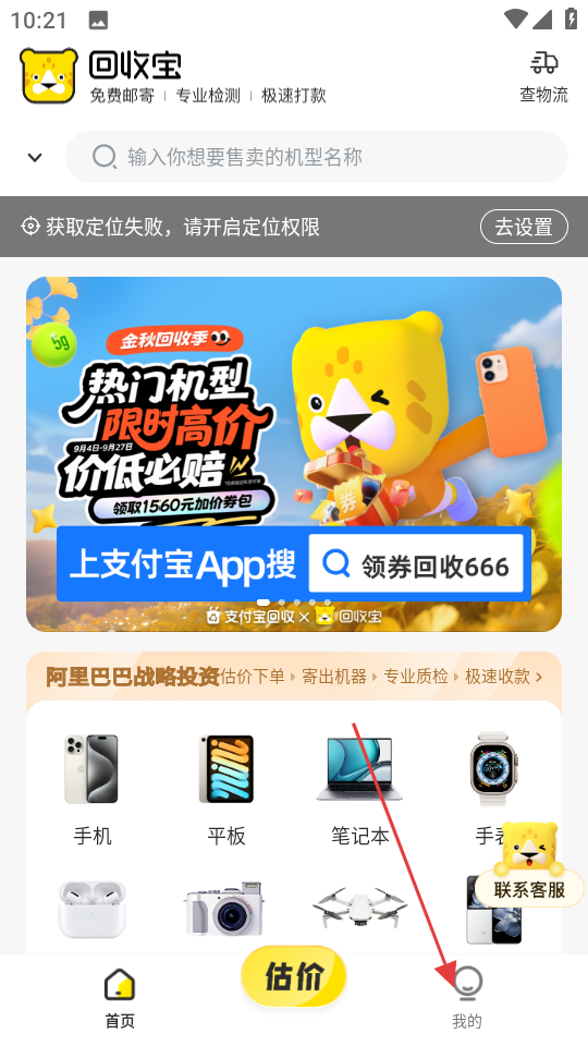 1、在回收宝首页,点击底部我的,进入个人中心页面。