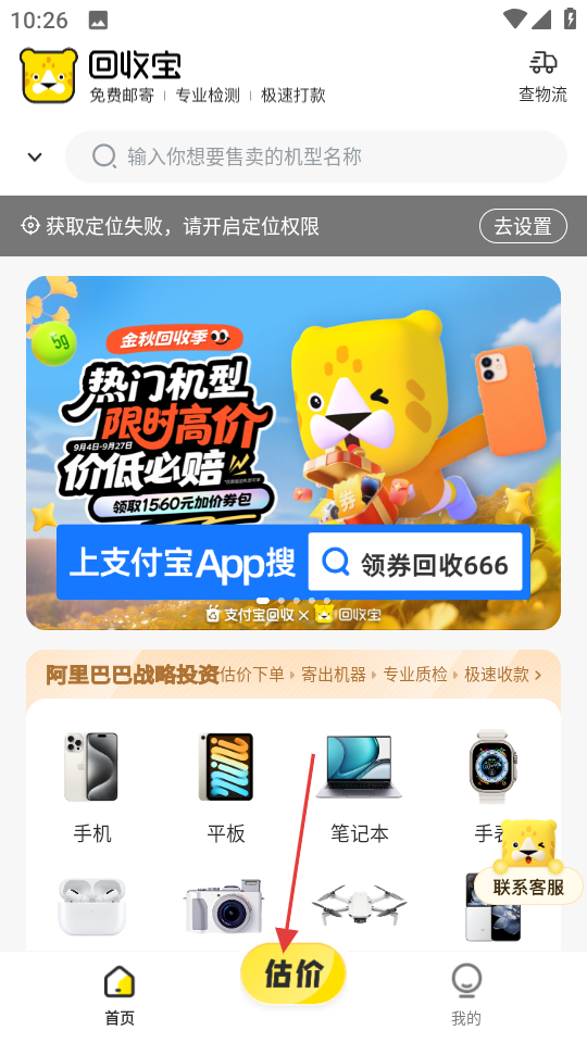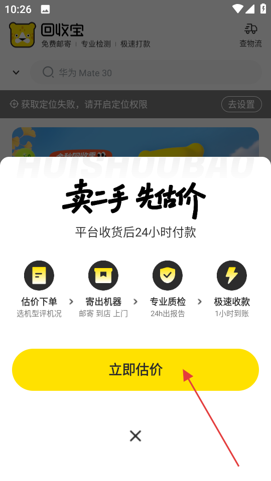 1、在回收宝首页,点击底部估价,弹出卖二手先估价提示框。