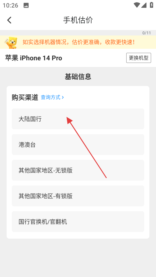4、在手机估价页面,选择购买渠道,如大陆国行,继续完成后续估价步骤。