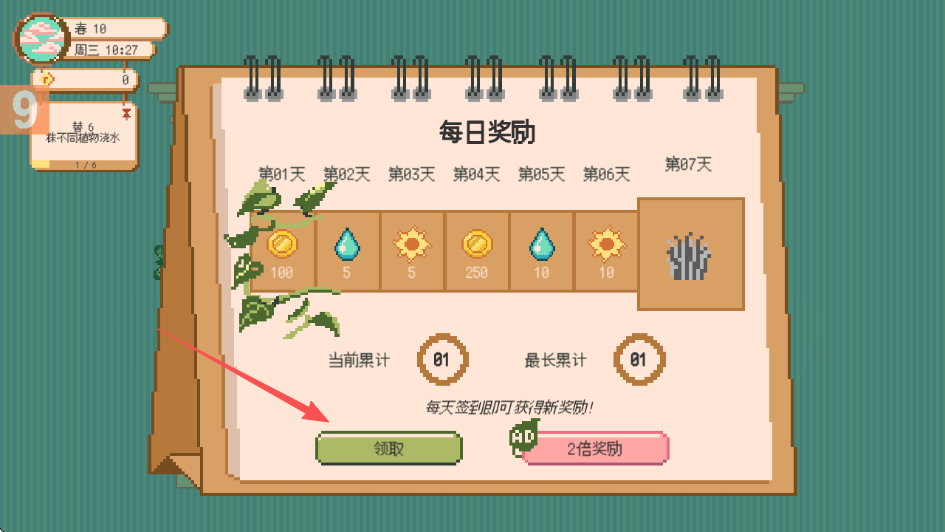 2、进入每日奖励界面,点击领取按钮,获取金币、水滴等奖励。