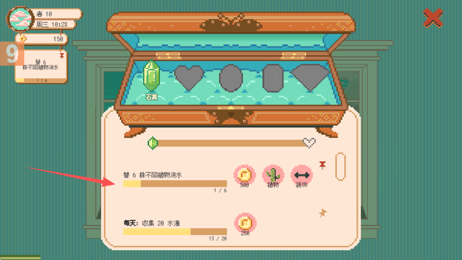 3、查看任务列表,按要求为6株不同植物浇水、收集28水滴,完成任务得奖励。