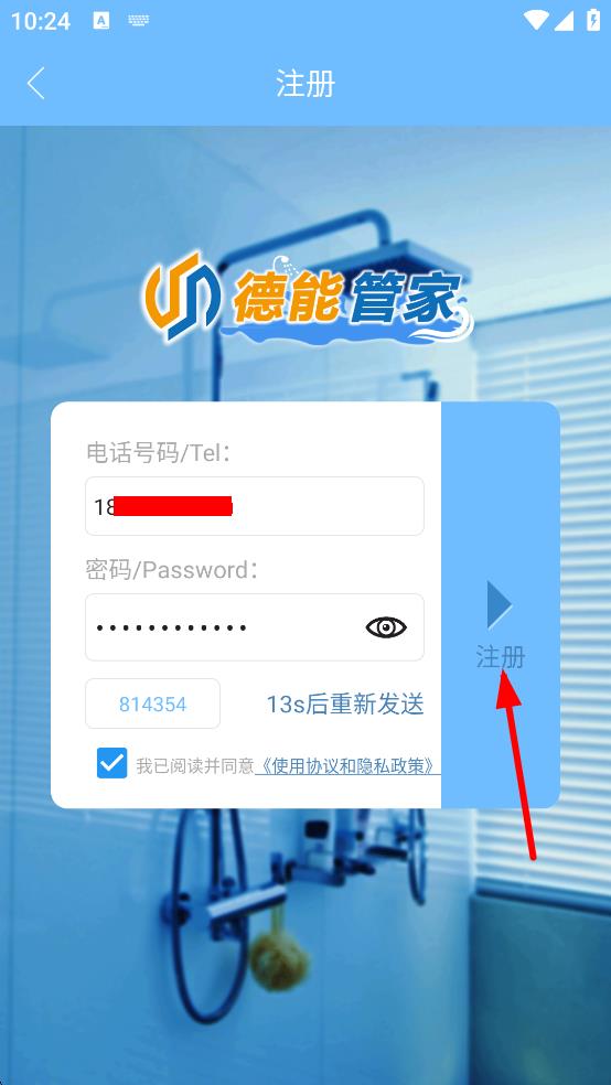 3、在注册页面,填写电话号码、密码等信息,勾选同意协议后,点击注册。