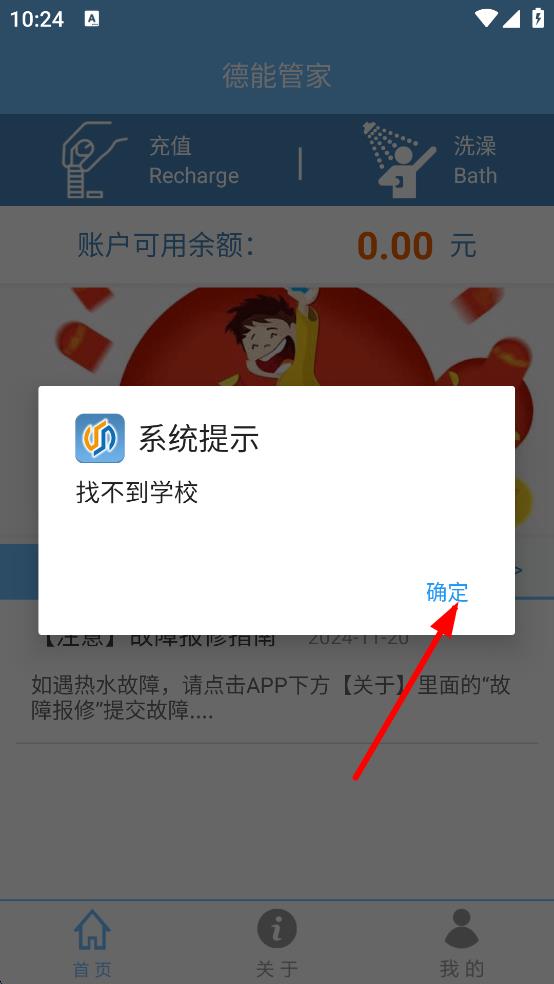 4、若出现找不到学校的系统提示,点击确定关闭提示。