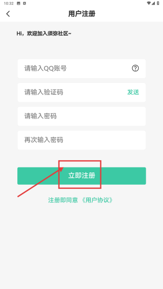 4、在用户注册页面,输入QQ账号、验证码和密码,点击立即注册按钮,完成账号注册。