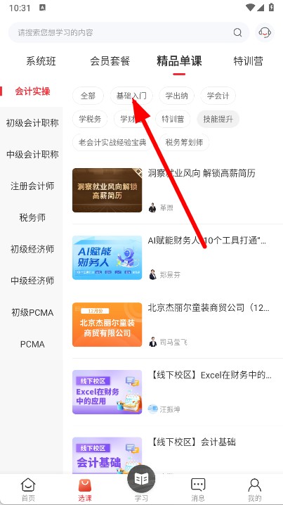 2、在选课页面的精品单课分类下,点击基础入门标签,筛选出基础入门类课程。