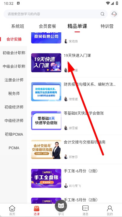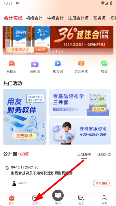 1、打开会计教练网校,点击底部导航栏的选课选项,进入选课页面。