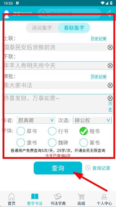4、完成设置后,点击查询按钮,即可生成带有书法字体的春联作品。