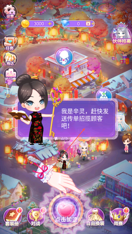 1、进入游戏,看到辛灵提示我是辛灵,赶快发送传单招揽顾客吧!按指示开始招揽顾客。