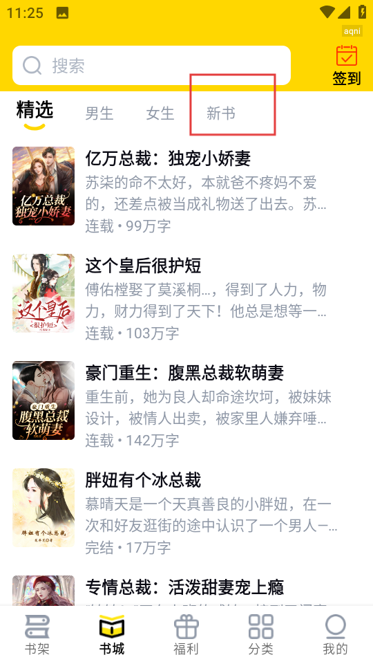1、在小说应用首页,点击新书,进入新书列表页面。
