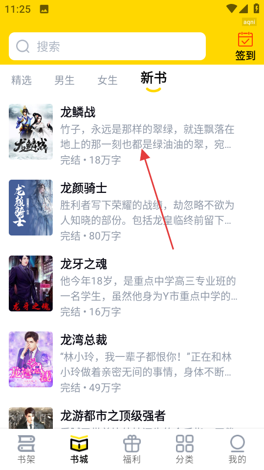 2、在新书列表页面,选择龙鳞战,进入该书详情页面。