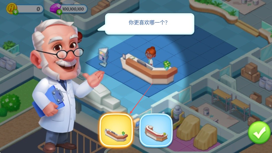 1、进入游戏,面对医生提问你更喜欢哪一个?,在下方两个物品图标中选择喜欢的那一个,点击绿色对勾确认。