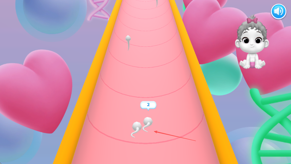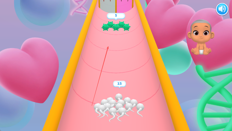 2、进入跑酷关卡,操控屏幕让跑道上的精子收集同色的精子,增加数量。