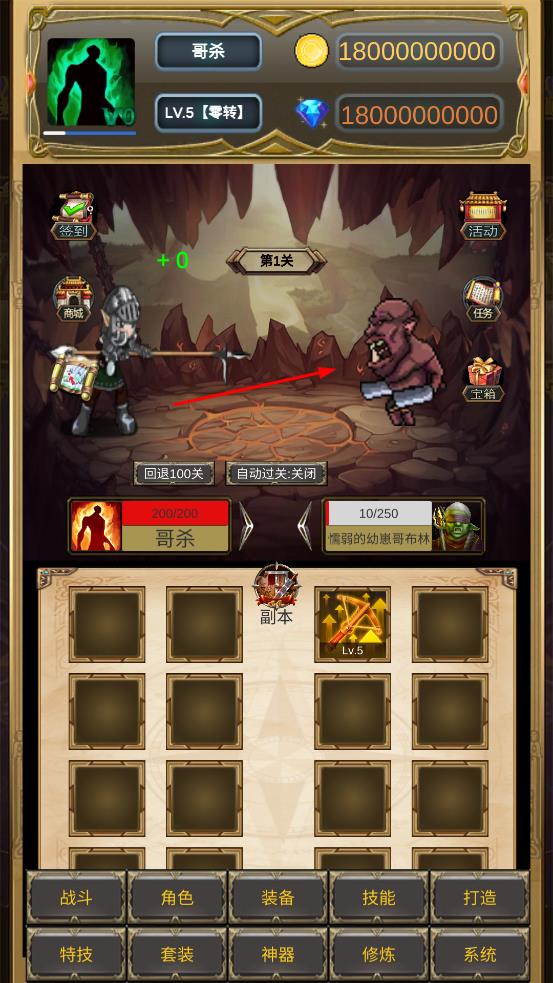 3、升级装备提升战力:利用挂机获取的经验提升勇者等级,同时更换或强化收集到的装备,逐步提高整体战斗力,当战力足够时就能挑战更强的哥布林。