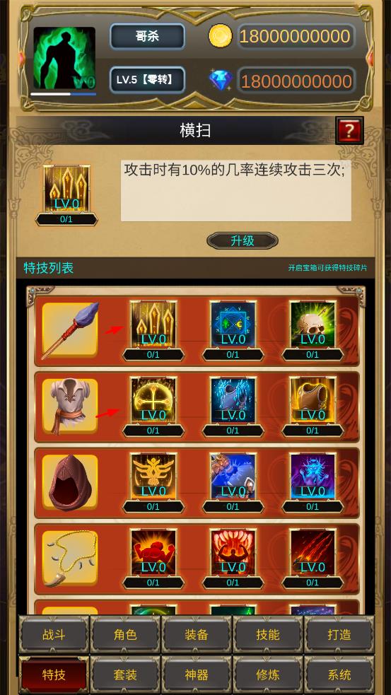 2、在特技界面,可查看并升级各类特技如“横扫特技,攻击时有几率连续攻击三次,提升战斗表现。