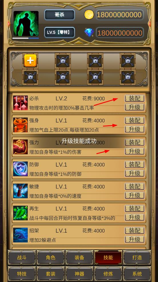 3、进入技能界面,消耗资源升级必杀,强身等技能,还可装配技能,增加暴击率、气血上限等属性。