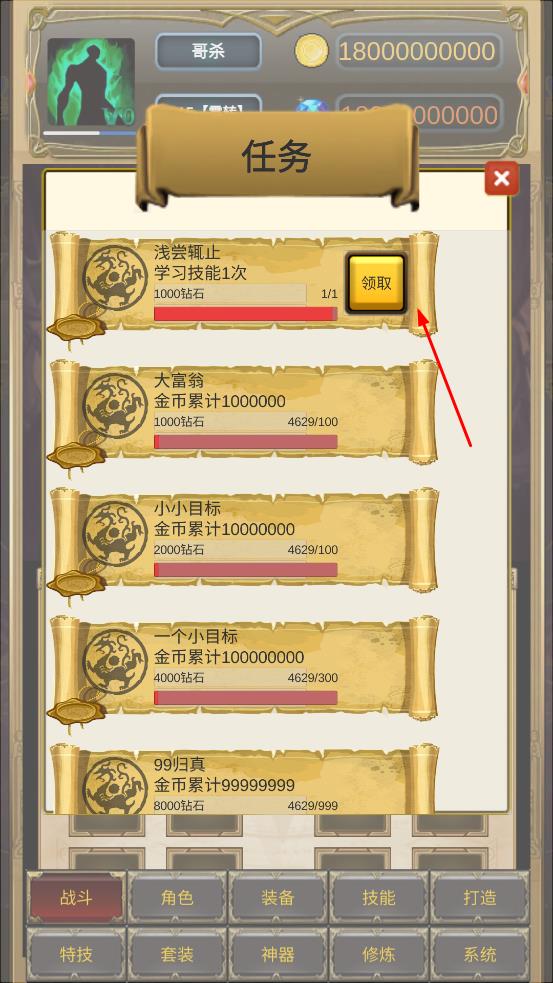 4、打开任务界面,完成学习技能,金币累计等任务,领取钻石奖励,助力角色成长与游戏发展。