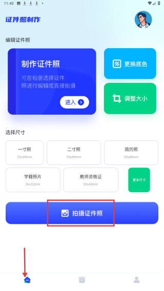 1、打开证件照制作应用,在证件照制作页面,可点击拍摄证件照按钮,进行证件照拍摄。