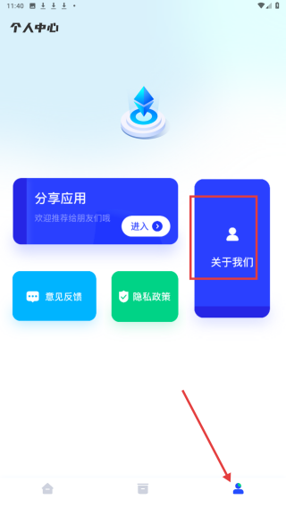 3、点击个人中心选项,进入个人中心页面,可查看关于我们等功能入口。