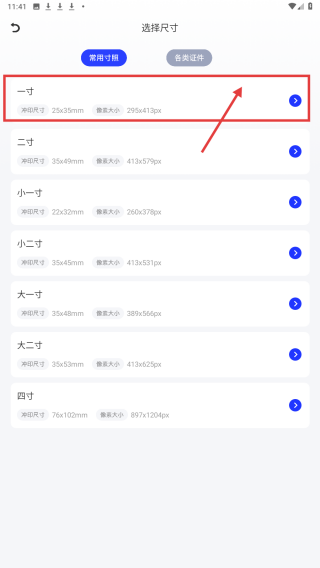 4、在选择尺寸页面,可挑选一寸、二寸等常用证件照尺寸,也可查看各类证件对应的尺寸。