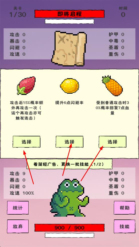 1、进入关卡前,从草莓、柠檬、菠萝等技能中选择,为战斗配置合适能力,助力闯关。