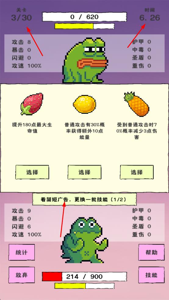 3、关卡推进过程中,可看广告更换技能选项,获取更契合战斗需求的技能,同时留意时间与关卡进度,逐步挑战更高关卡。