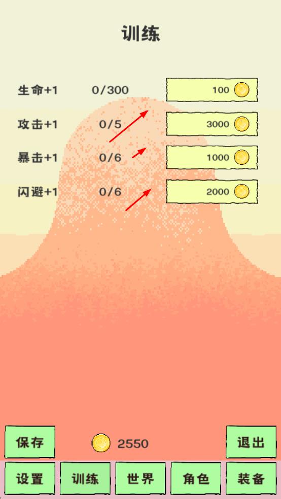 4、进入训练界面,消耗金币提升生命、攻击、暴击、闪避等属性,强化角色基础能力,为后续战斗做好准备。
