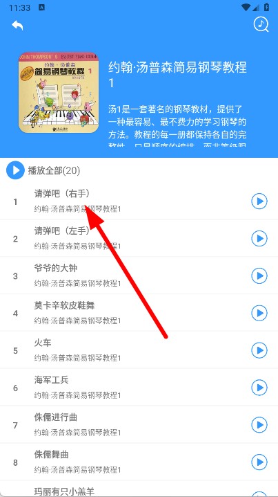 3、进入教材后,选择具体的曲目,点击曲目名称。